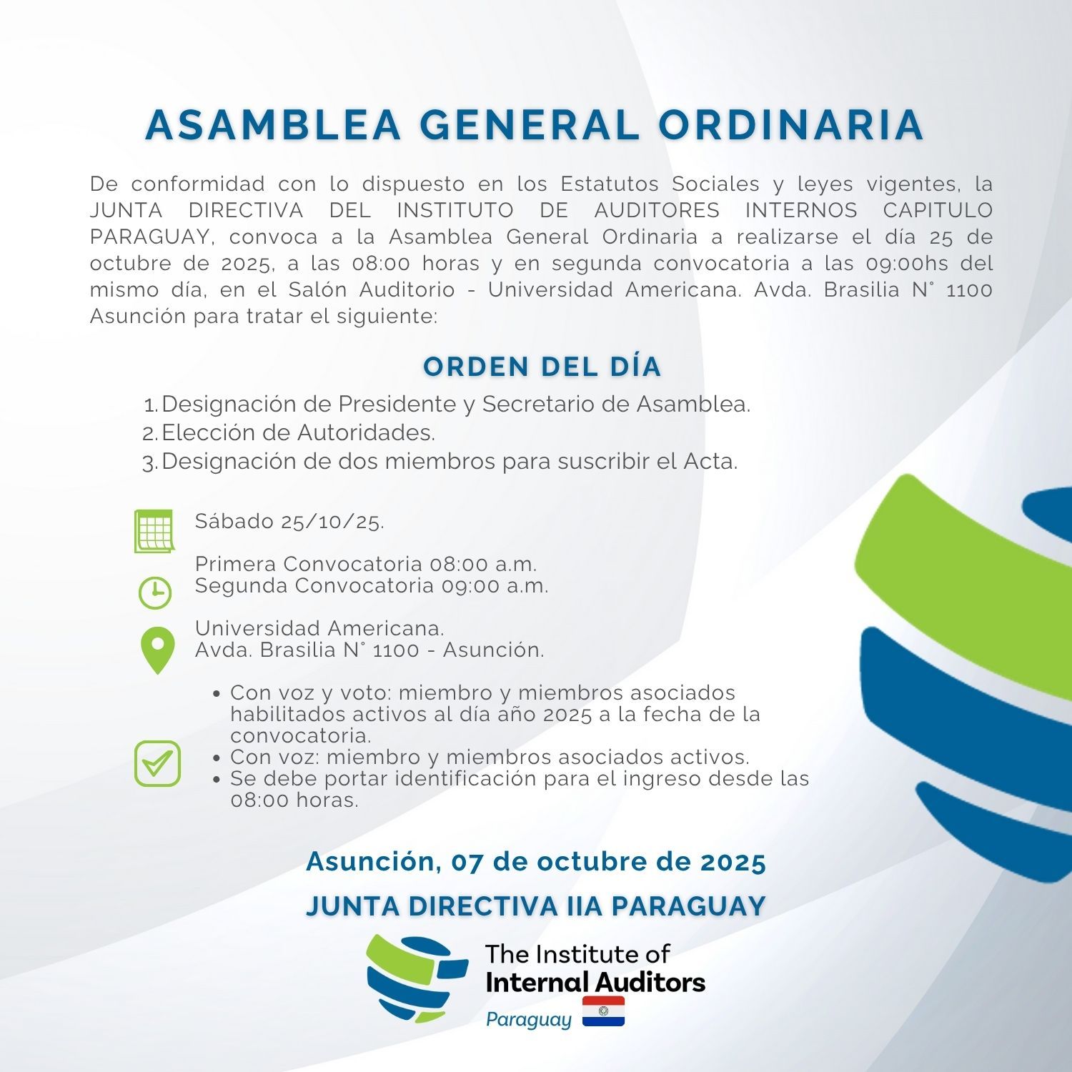 El Instituto de Auditores Internos del Paraguay exhorta a sus miembros y miembros asociados a participar activamente en la próxima Asamblea General Ordinaria, conforme a lo establecido en el estatuto vigente.