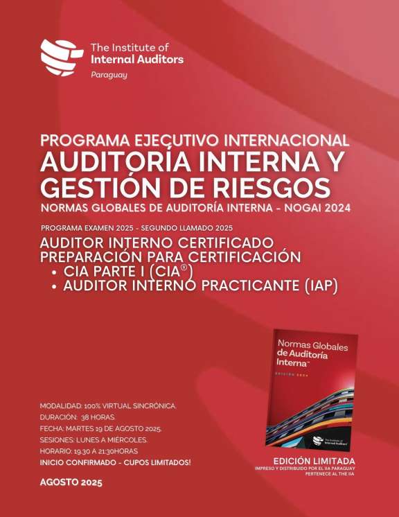 La formación ofrece un enfoque práctico y alineado a las Normas Globales de Auditoría Interna, fortaleciendo la capacidad del auditor para generar valor estratégico dentro de su organización. De esta manera, la inversión en el programa se traduce en beneficios concretos tanto para el crecimiento profesional del participante como para el fortalecimiento institucional y el desarrollo del país.Gs. 2.750.000